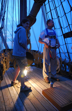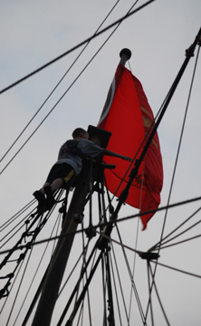 Another night at anchor, another opportunity to go rescue a snagged flag from the fore mast. Tonight it's Nick's turn to ascend to the ship's uppermost heights.
