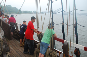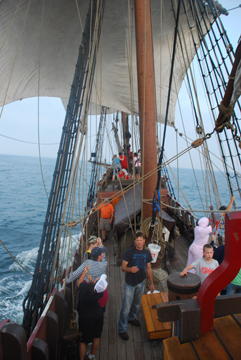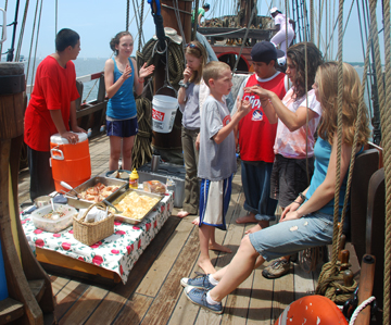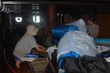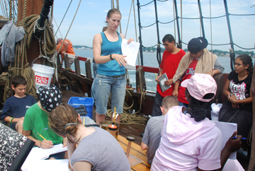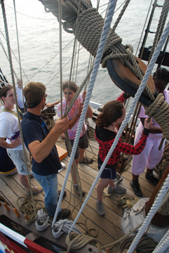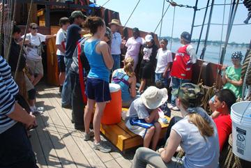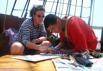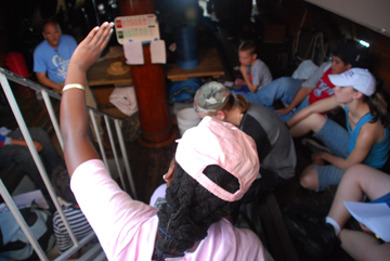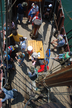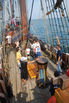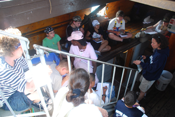 After we're underway, Ms. Dulen-Jennings and Ms. Cowles gather the student crew on the orlop deck to offficially begin their presentation projects. Topics are assigned, which you'll soon be able to read about in our Learning Pages.