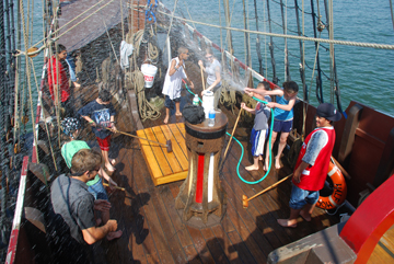 It's turning into a seasonably hot and muggy day, so we bring up the hose and treat ourselves to another deck wash -- as much for the crew's sake as that of the ship.