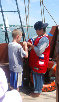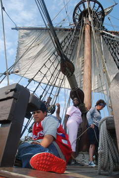 Mr. Schuijer asks his main mast team to explain the steps needed to set the main course, and David immediately has the answer. Our student sailors are coming along nicely!