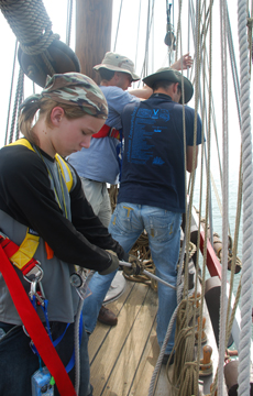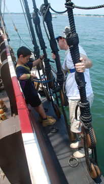Once they finish collecting data, both Carlos and Ms. Cowles follow Ms. Read up into the rigging to take their hang tests and spend some time aloft.