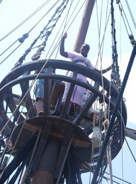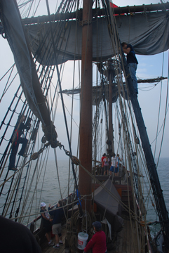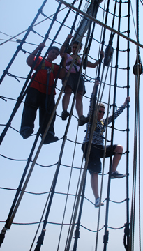 We have a few crew members who have not yet climbed aloft -- those heights can be intimidating! However, one by one, all of our remaining deck-bound crew decide to take advantage of the lull in the action and scale the masts.
