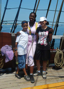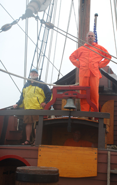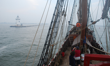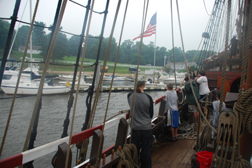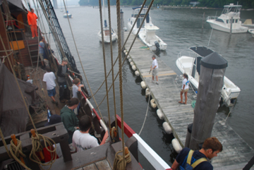 By the time we start maneuvering around the sandy shoals at the mouth of the Connecticut, a thick fog has descended on the ship. We douse and furl the sails in preparation for our arrival.