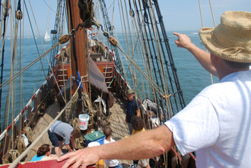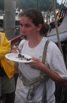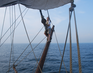 As we motor along, Ms. Reilly, a professional rigger, entertains us by climbing out on the sprit (the angled wooden mast jutting up from the bow of the ship).