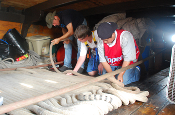 After the capstan team has done its work, Mr. Schuijer moves up to assist the fore deck team. David tails as Mr. Schuijer and Mr. Coolidge sweat the tackle pulling the anchor up to the channel.