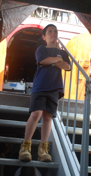Jamie stands on the main stairs and acts as communicator, relaying messages back and forth between the captain and the below decks teams.