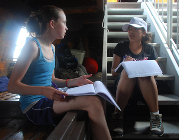 After the meeting, students meet with their research partners to discuss their projects. Nora and Jessica will be measuring current speed during our layover at East Haddam.