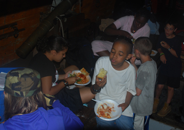 Dinner is served on the orlop deck to avoid the dampness outside. Tonight we enjoy chicken parmegon, pasta, and garlic bread.
