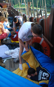 We also discover that Nick has competition for the title of Champion Wriggler; in his sleep, Jamie has managed to squirm around the capstan, past Alex's air mattress, and across half the weather deck. It's a good thing he didn't fit through the scuppers!