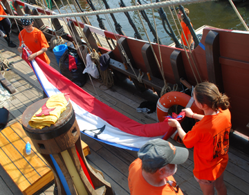 In preparation for our departure, Carolann and Nora work together to run up the ship's flags.