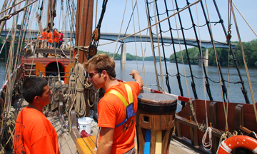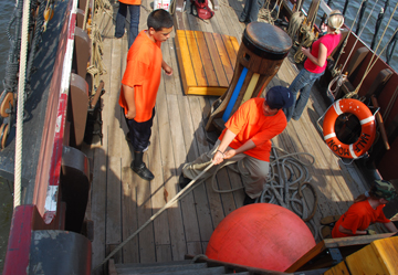 As we close in on the Goodwin Riverside Campus, we douse our sails and Mr. Schuijer assigns docking positions to the crew. Carlos will be passing Line Two to our assistants on the dock.