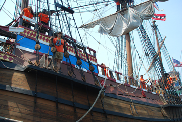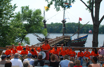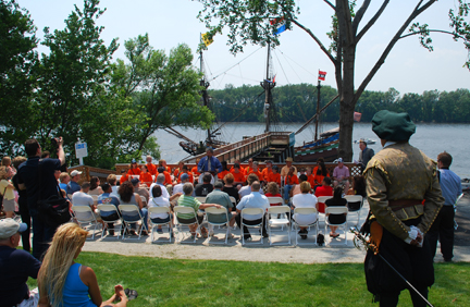At the arrival ceremony, the distinguished crew of the Half Moon is greeted by dignitaries, press, friends, family, and assorted well-wishers...