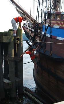 On our final attempt, Ms. Reilly and Ms. Read climb over the water to a towering "dolphin" piling to secure Lines One and Three. Using them as leverage, we quickly maneuver the Half Moon into position.