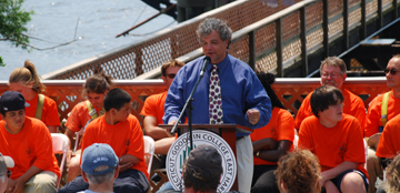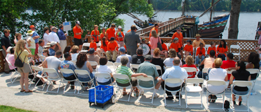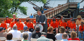 Lastly, Captain Reynolds takes the podium to congratulate the student and senior crew and discuss the Half Moon's programs.