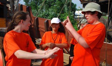 Ms. Read's lessons in sign language seem to have left an impression; while hanging out on the weather deck, several students try to work out the signs for "Sailing Ship Half Moon."