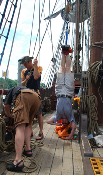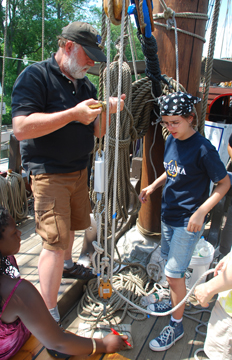 For our experiments in mechanical advantage, we rigged a block-and-tackle system designed to lift a lead ballast ingot (safely wrapped in canvas) a few inches off the deck, using from one to four pulleys to distribute the load. As students haul on the line, a spring scale measures how many pounds of force must be exerted to lift the weight. As an interesting side wrinkle, our spring scale can only measure up to 50 pounds, and the ingot weighs considerably more. Thus, students must extrapolate the ingot's true weight from their findings.