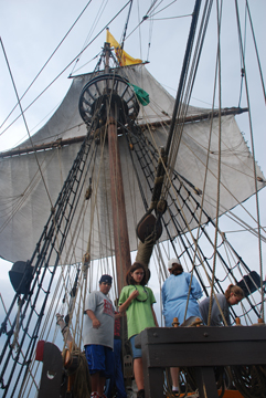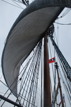 Working the sails requires a lot of hands, and thus a lot of cooperation. The crew divides into teams while sail handling -- one team working the fore mast while the other works the main mast. The spritzel and mizzenmast sometimes see use as well, though these require advanced training. The mast teams must coordinate their efforts to effectively steer and propel the ship when under sail.