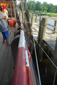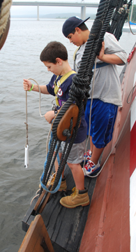 When in doubt, we take soundings (measure the water's depth) with the same tool Hudson's crew would have used: a lead line (or sounding line). Flags attached to the lead line mark depth in 6-foot increments (fathoms). The Half Moon has a draft of 8-1/2 feet (extending that far underwater), so it needs at least a fathom and a half of water to stay clear of the bottom.