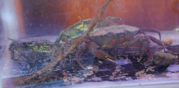 These crabs were collected during a Zodiac expedition in Niantic Bay. Jamie and Nora were first to identify them as two different species; the green crabs are, shockingly, called green crabs, and the larger, brick-red crab is an Atlantic rock crab.