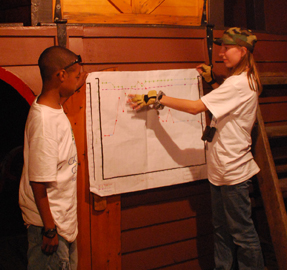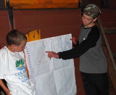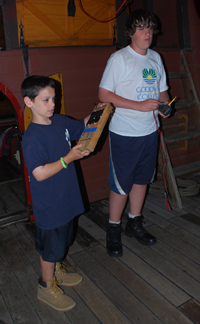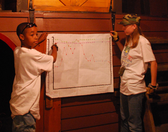 Carlos and Gabriel used a lead line to sound the water's depth at East Haddam over a 24-hour period. This is a traditional and reliable method that was in use on Henry Hudson's ship in 1609. Their readings showed a steady fluctuation in the height of tide, and shared their data with Jessica and Nora, showing a possible loose correlation between height of tide and local tidal currents.