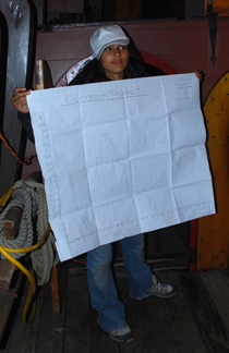 After their first-hand experiences with sail handling and the rig, Carolann and Oksãna were able to apply the applications of mechanical advantage on a working square-rigged sailing vessel. To determine the relationship between force needed to lift a weight and number of blocks (pulleys) used, the two designed a model rig on the weather deck and were able to develop a formula out of their test results. Ultimately, they used this formula to design and implement a rig to lift Ms. Reilly one foot off the deck, and to calculate her weight from their results.