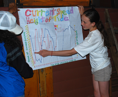 Jessica and Nora conducted an experiment to measure the speed of the Connecticut River while the Half Moon was docked at East Haddam. They measured the speed by placing a wood chip or crouton in the river and timing its journey from two fixed points on the weather deck. They also tested for error by "racing" different flotation materials against each other: chips vs. croutons, and pre-soaked materials vs. dry. They then graphed their data and compared it to Carlos and Gabriel's data on tidal height.