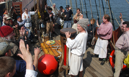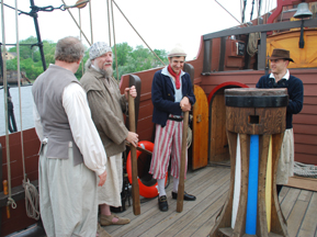 In a cozy spot under the stairs on the orlop deck, our musically inclined re-enactors have clustered together for a jam session. The notes of one tradional song after another waft through the ship well into the evening.
