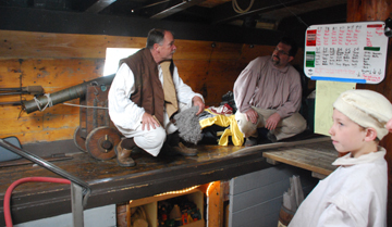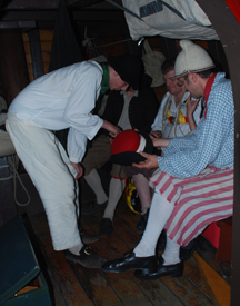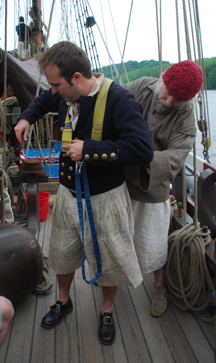 Randi dell'Acqua is helping us design and create new period uniforms, similar to the slops Nick is wearing here. As part of her work, she's shown Nick how to sew the seams on a miniature pair of britches made from scrap fabric.
