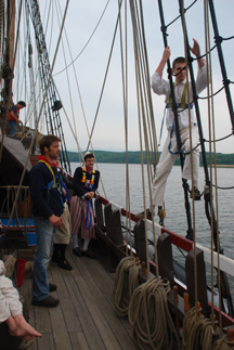 Up above, the top men prepare to set the top sails -- and enjoy the thrill of seeing the Hudson River from four stories in the air.