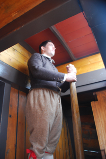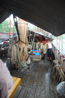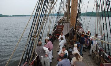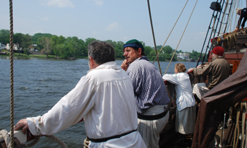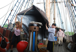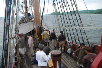 Meanwhile, Pete Condrick and Jim Gartner keep alert on the fore deck, acting as lookouts. Due to the physical limitations of the whipstaff, the crew actually steering the ship have an obstructed view of the water; lookouts act as their eyes, watching for obstacles and river traffic.