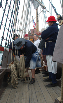 On the starboard side, Pete Condrick mans the main course sheet. Afore of him, Scott Padeni and Ron Toelke man the clew, martinette, and bunt.