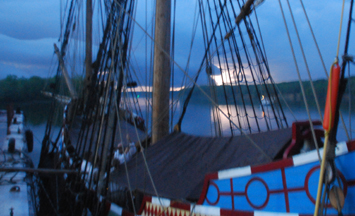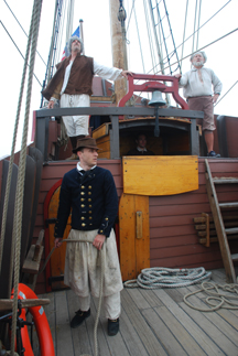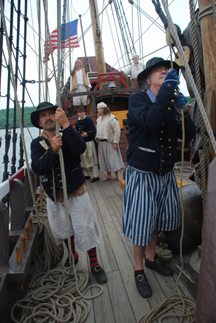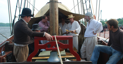 As the sun sets, the rains have passed over us. Clusters of the crew chat into the evening on the weather deck, discussing period fashions and designs.