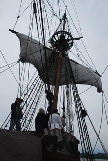 We intentionally backwind the fore course. This pushes the ship's bow away from the wind, thus turning the ship around. The narrow portions and twisting turns of the Hudson River provide ample opportunity for practicing such maneuvers.