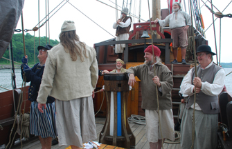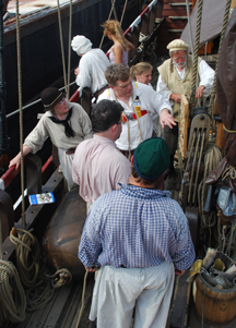 In the foc's'le, Frank Rodrigues uses his laptop computer to display designs in an insider's discussion of period clothing, including styles of the period and how or where to make or procure historical garb now.