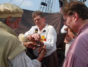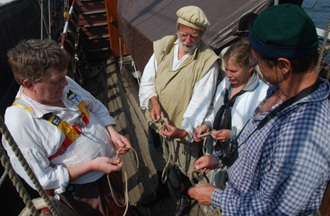We split into several groups, based on invididual crew members' interests. These include: historic navigation, sail handling, knots and marlinspike, clothing and black powder arms.