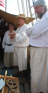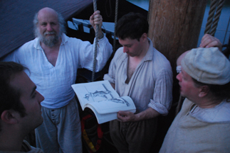 Another group meets on the quarterdeck to disucss historical navigation techniques. Steve Eftimiades left behind some of his handmade instruments for crew members to examine, and Captain Reynolds provides background on the development of navigational sciences.