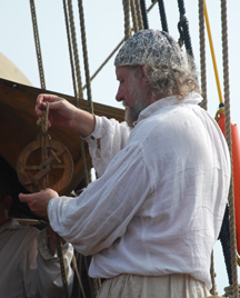Matt Brenckle mans the whipstaff. The whipstaff handles very differently depending on the current traveling conditons -- such as whether the ship is under sail or on engine power -- and always takes some getting used to.