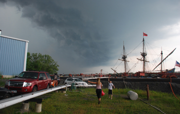 Here comes the storm, which brings a quick return to the safety of the ship from crew who had to step ashore for chores.