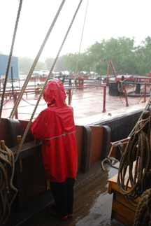 As the skies open up yet again, Nick Reynolds stands a lonely vigil on the quarter deck.