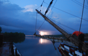 Due to this risk of lightning strikes, we've decided to remain moored at Peckam Materials through the night rather than heading back out into the channel and setting anchor.