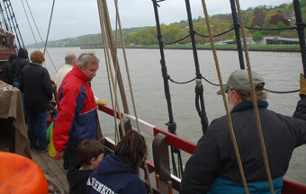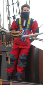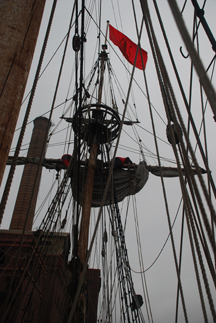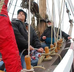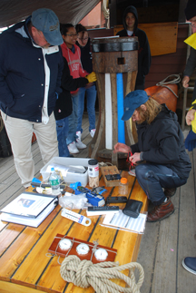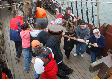 Special congratulations today go to Keith, who personally manned the helm for a marathon two-and-a-half-hour session. At 1600 hours, he initially volunteered to substitute at the helm for a fellow Port Watch member who was working with Dr. Jacobs on her science project, with his own shift following immediately thereafter. However, by the time his own hour at the whipstaff was up, we were the thick of docking procedures, so he maintained his post until the ship was finally secure and the whipstaff safely lashed.