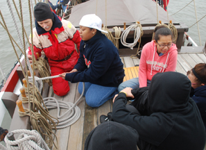 Meanwhile, up on the fore deck, Mr. Moore and Mr. Hansen introduce a second group of students to line handling, an essential element of shipcraft.