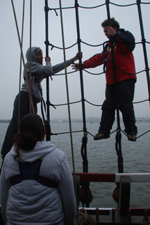 Meanwhile, Captain Reynolds and several members of the senior crew climb aloft to furl the sails for the night. Tomorrow, however, we think we may have an opportunity to set sail!