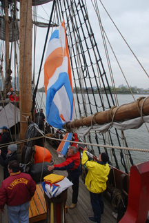 We are now underway and raise our flags. This multicolored flag represents the Seven Provinces of the Netherlands (as they existed in 1609); the original Half Moon would have proudly flown a flag just like this.