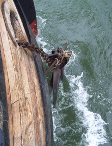The capstan team breaks the anchor free from the harbor's bottom and pulls it to the surface. As the anchor rises into view, however, we discover that it has somehow entangled itself in its own chain and is now precariously hanging upside down. This is not an unprecented situation, however, and our crew knows what to do. With a little extra patience, a bit of elbow grease, and a great deal of caution, the senior crew members secure the anchor so it cannot fall, free the tangled chain, and safely turn the anchor upright. The anchor is soon securely lashed to the starboard fore channel, right where it belongs.