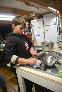 Most of the action is taking place below decks. On galley duty, Jacob dutifully cleans the dishes from lunch. Later on, we'll serve pretzels, peanuts, and popcorn for snacks.