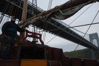 The fog is lifting and the tide is turning in our favor. Time has come to weigh anchor and begin our journey up the Hudson River. While one team of senior and student crew members work below on the orlop deck to guide the anchor rode (line), another large team walks the capstan. This massive winch uses mechanical advantage to combine the strength of everyone using it.