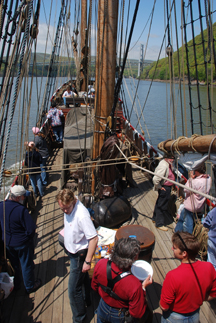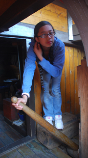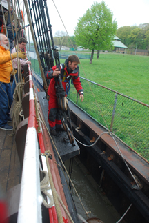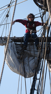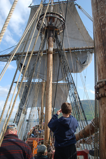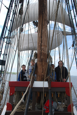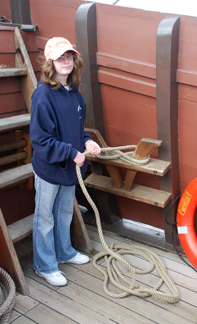 A: Yes, it was really fun working in the rig. I didn’t go that high because I was too scared. When we furled the sails we had to “slack” the bunt, martinet, and clew ropes and pull on them, and then we had to tie the ropes back to the pin and coil the rope. But when we unfurled the sails we let the rope go and tie it up again.