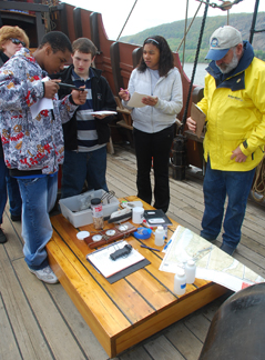 As we motor north through the bay, Mr. Linehan supervises as Kristie records a temperature reading for her project.