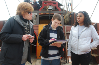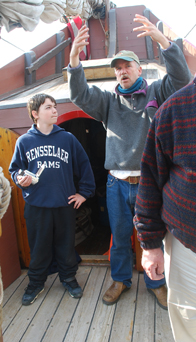 The Rensselaer students have brought a video camera with them, with Jacob as their skilled videographer. Captain Reynolds gives Jacob some directorial tips on how best to capture the sails on screen.
